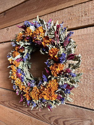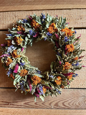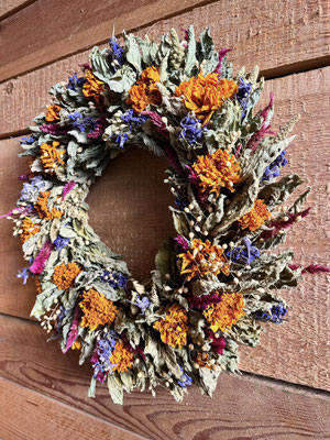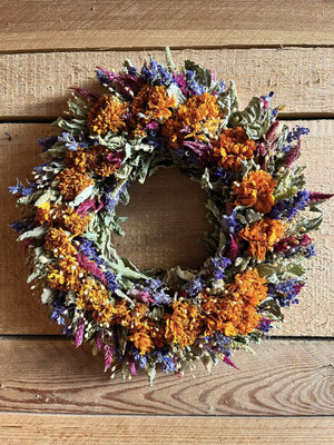 Biotrockenblumen · 07. Oktober 2025 Tagetes Zwei unterschiedliche Kränze mit den gleichen Zutaten: Celosie, Rittersporn, Tagetes, Leindotter und Amaranth. tagPlaceholderTags: